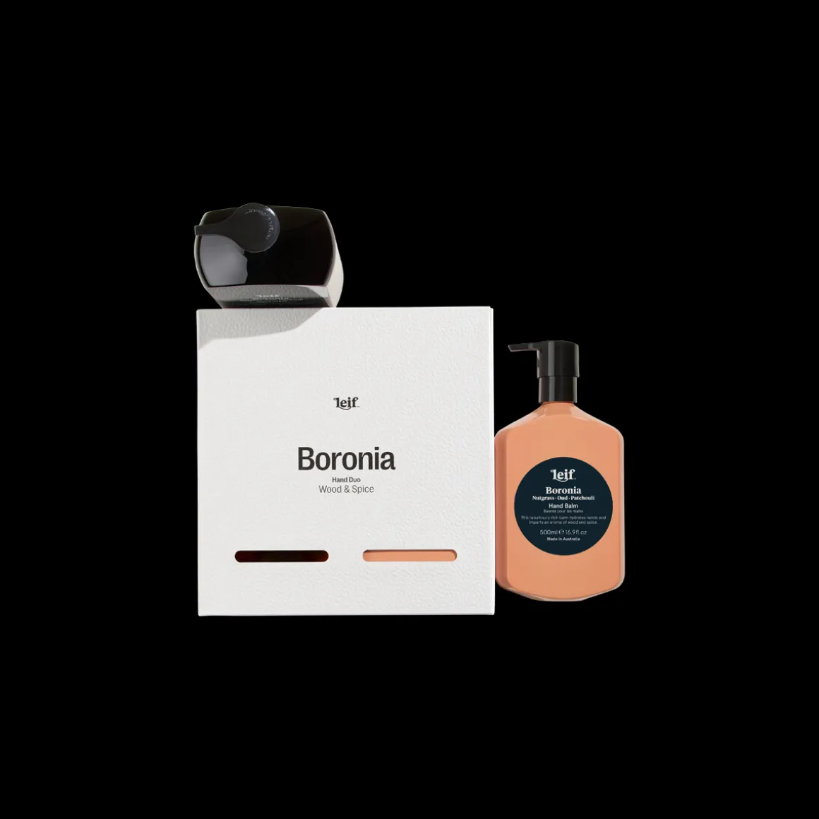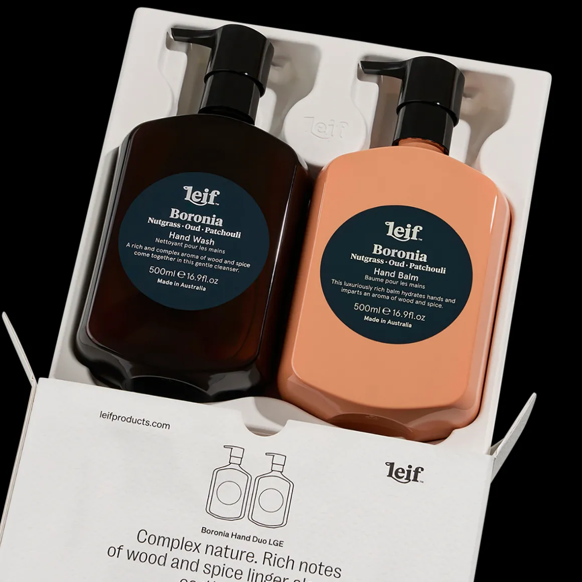 Boronia Hand Duo Large van Leif is een set die verfijnde handverzorging biedt met een houtachtig en spicy aroma. Deze set bevat de Boronia Hand Wash en Boronia Hand Balm, beide rijk aan antioxidanten en anti-inflammatoire eigenschappen. De producten reinigen, hydrateren en beschermen de huid, terwijl de diepe geurnoten een rustgevend effect geven.