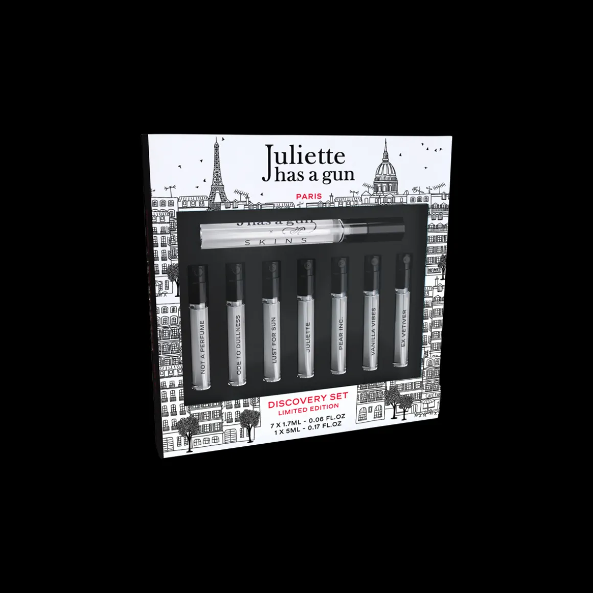 Met de Discovery Set Skins x Juliette has a gun Eau de Parfum test je acht bestsellers van Juliette has a gun in alle comfort van thuis. Deze set bevat een deluxe mini (5 ml) van Skins x Juliette has a gun Eau de Parfum, en daarnaast zeven samples (1,7 ml) van:
