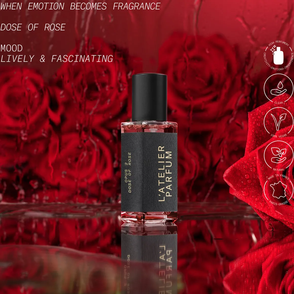 Dose of Rose Eau de Parfum van L’Atelier Parfum is een verfijnde bloemige geur die de klassieke roos op een moderne manier herinterpreteert. In de top ontvouwt zich een sprankelende combinatie van saffraan en kardemom, gevolgd door een rijk hart van rozenblaadjes en jasmijn sambac. De basis van cederhout, papyrus en leer geeft de geur diepte en warmte, voor een langdurige en elegante geurervaring.
