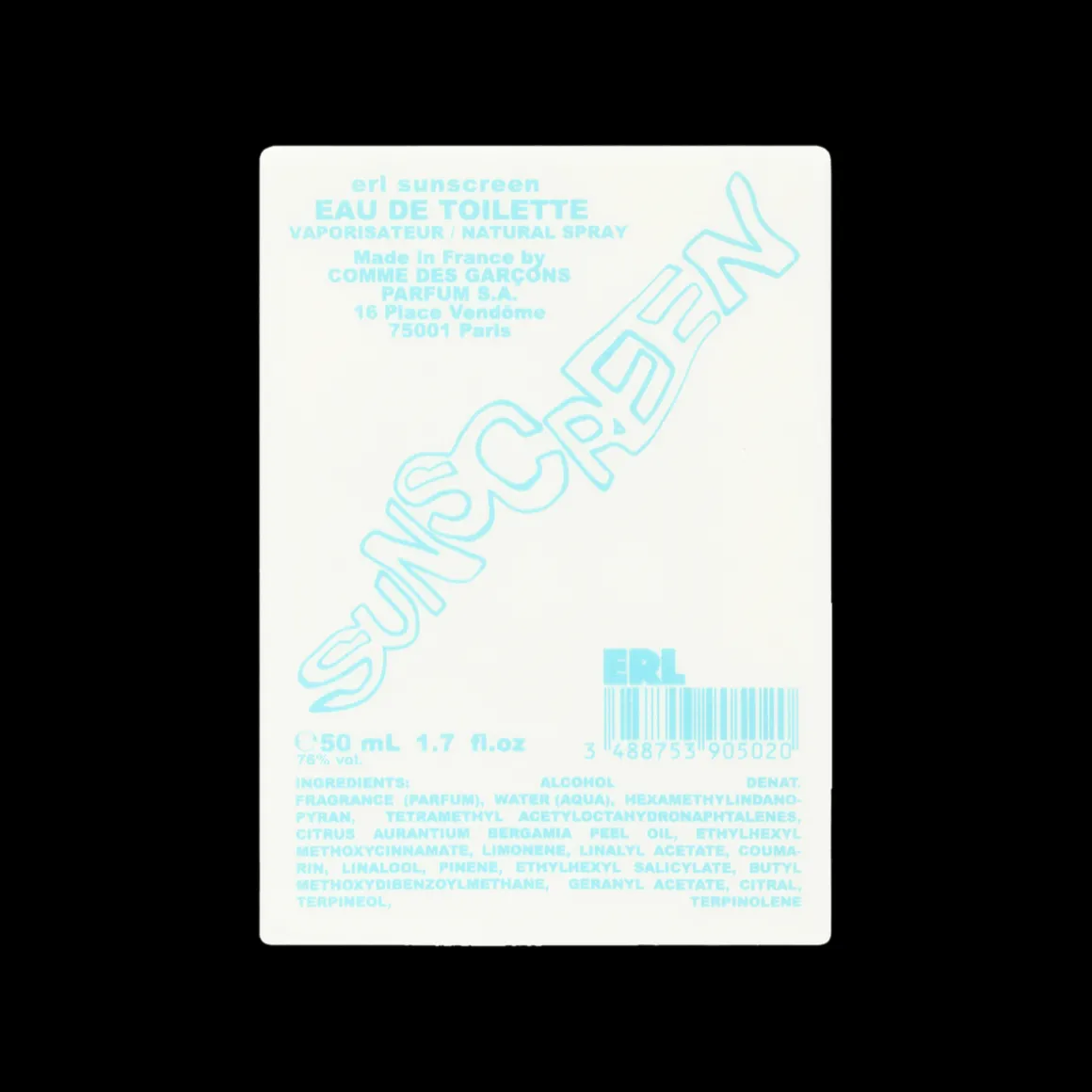 ERL Sunscreen Eau de Toilette van COMME des GARÇONS roept de vluchtige herinnering op aan een nostalgische zomer. De warmte van de Californische zon op zoute huid wordt afgewisseld met frisse opspattende golven en de geur van chloor in de lucht. Een zomers beeld van Venice Beach, gevangen in geur.