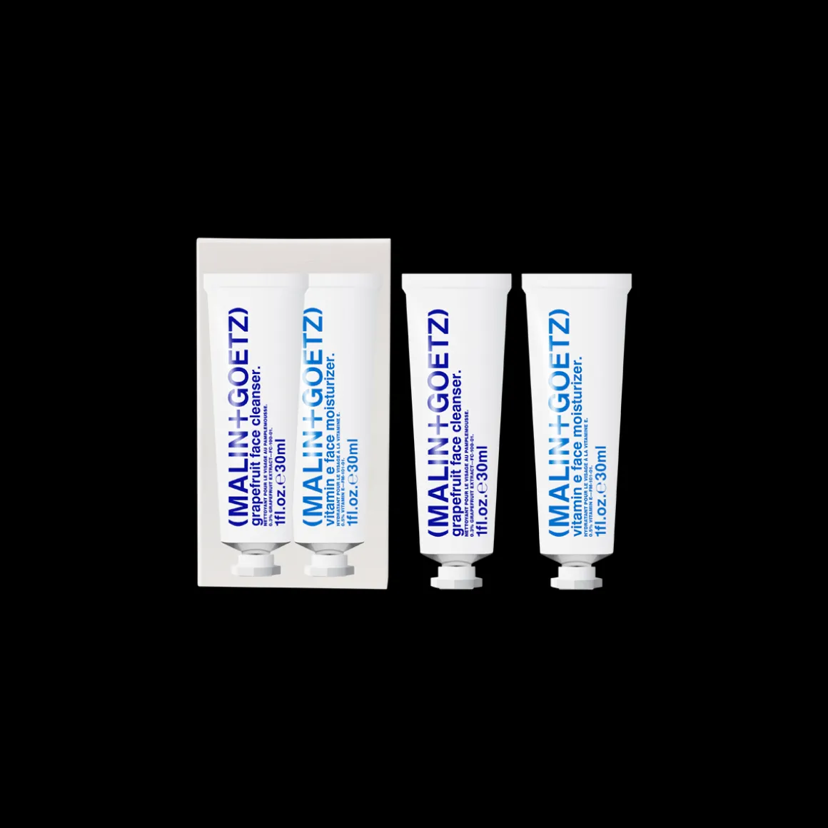 De Face Essentials Travel Size van MALIN+GOETZ is een huidverzorgingsset inclusief een gezichtsreiniger en een moisturiser in reisformaat. De Grapefruit Face Cleanser biedt een milde maar grondige reiniging, terwijl het tegelijkertijd hydrateert. De Vitamin E Face Moisturizer zorgt voor intensieve hydratatie en brengt de huid effectief in balans. Samen vormen ze een harmonieuze routine voor een frisse en goed gehydrateerde huid – ideaal om kennis te maken met de MALIN+GOETZ skincare routine en om mee te nemen op reis.