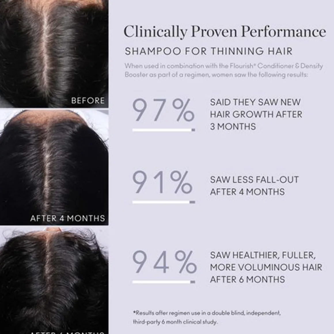 Een beetje shampoo tussen de handpalmen tot een schuim laten komen. Breng de shampoo aan op nat haar en masseer de hoofdhuid in, begin bij de nek, en werk het schuim door tot in de uiteinden. Spoel grondig uit. Voor het beste resultaat, gebruik daarna de Flourish Conditioner voor dunner wordend haar.
