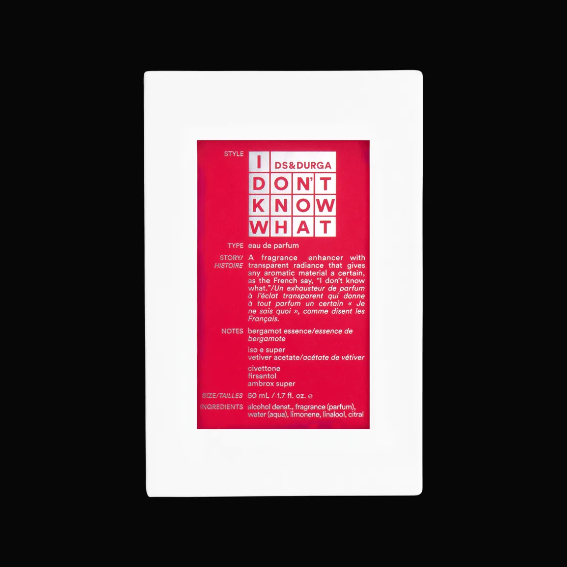 I Don’t Know What van D.S. & Durga geeft elke geur een boost die niet in één woord te vangen is. Of zoals de Fransen zeggen, een vleugje ‘je ne sais quoi’. Dit Limited Edition eau de parfum is een geurversterker die door middel van aromachemicaliën extra levendigheid geeft aan elke parfum(olie) waar dit product overheen wordt gesprayd. I Don’t Know What heeft zijn eigen citrus- en houtachtige unisex-geur, samengesteld uit krachtige synthetische moleculen, maar is ook het perfecte parfum voor perfume layering om je eigen, unieke geur te creëren.
