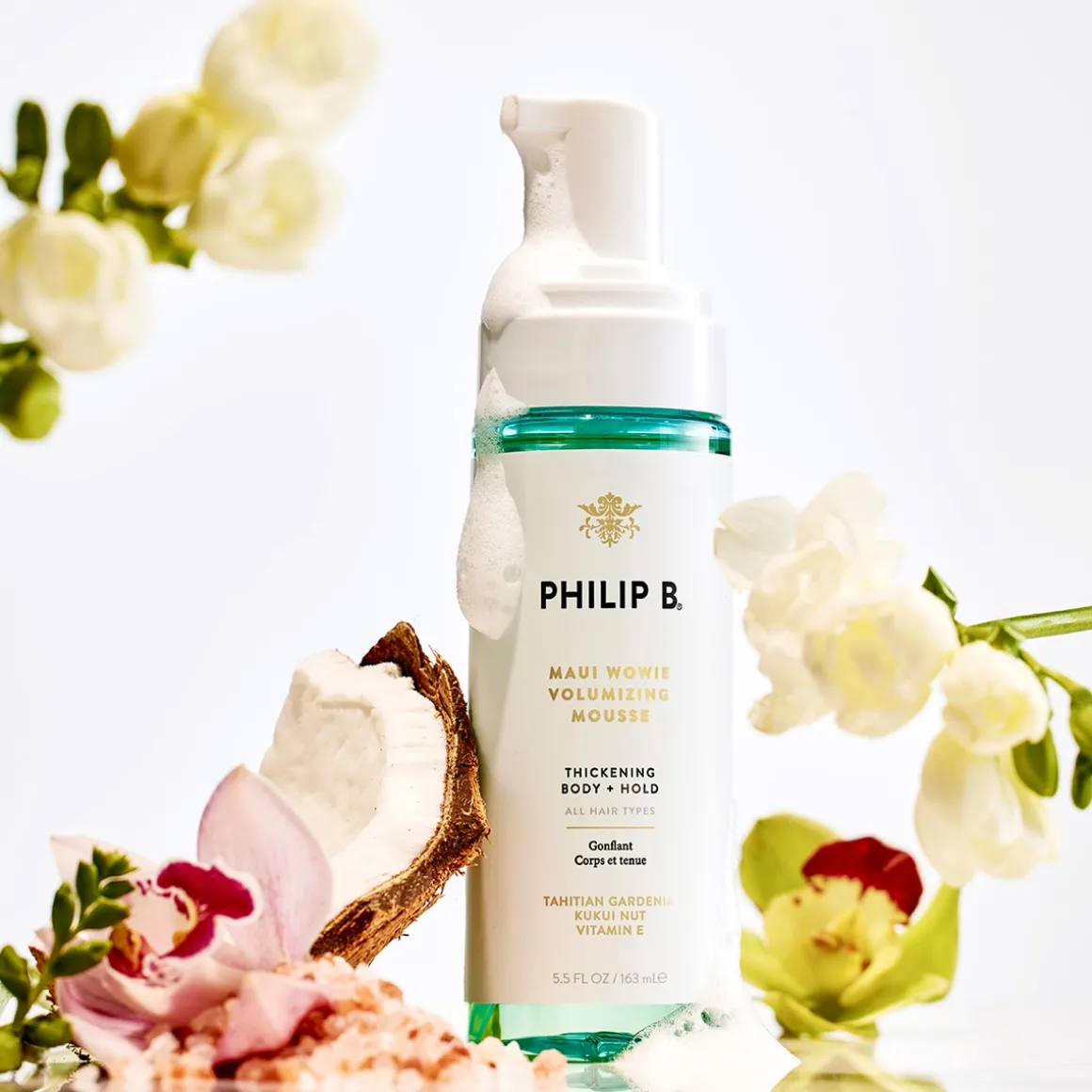 De Maui Wowie Volumizing Mousse van Philip B is een luchtige haarmousse die volume geeft aan fijn, plat of krullend haar. De formule van onder meer zee-extracten en tarweproteïnen zorgen voor een levendige en volumineuze look, zonder het haar te verzwaren. De warme en sensuele geurcombinatie van kokosnoot, orchidee en gardenia uit Tahiti nemen je ondertussen mee naar een tropisch eiland.