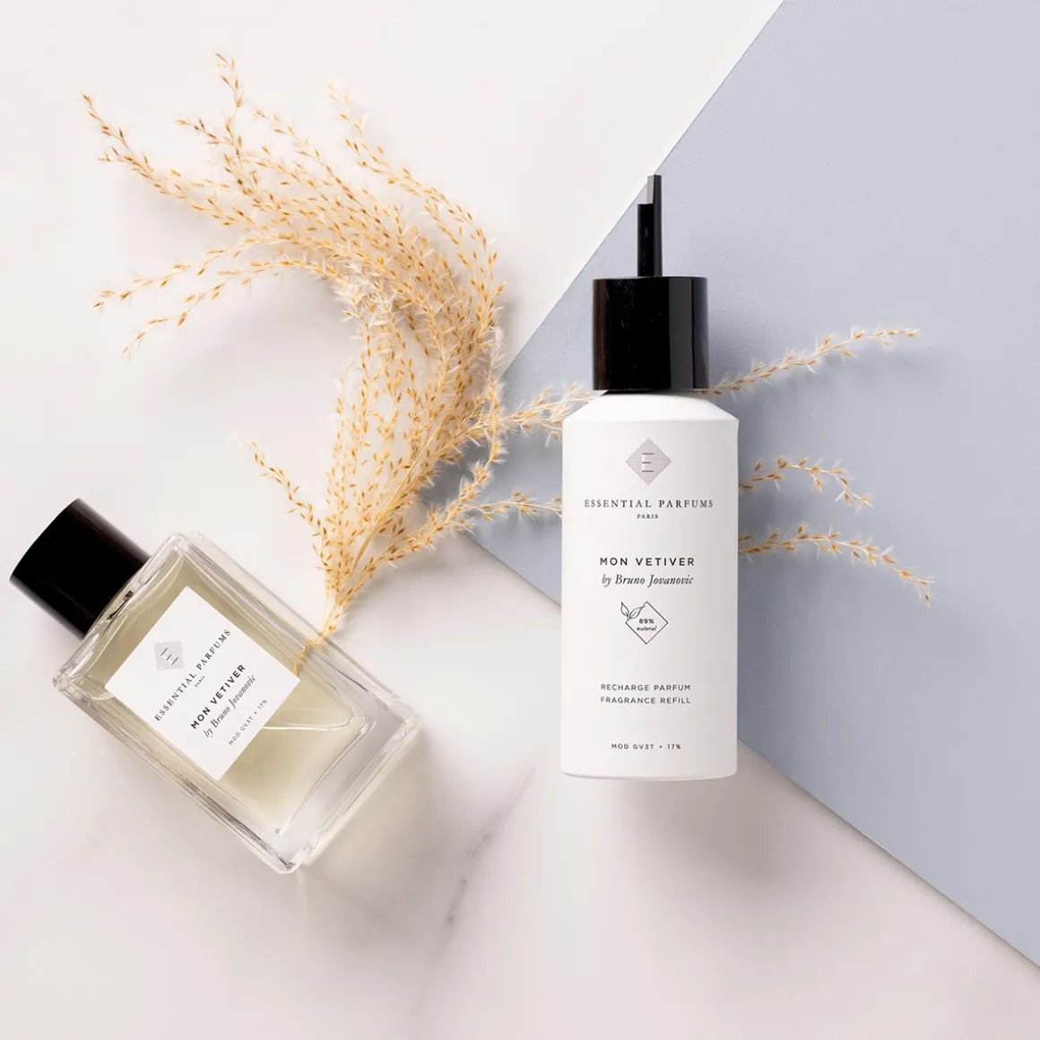 De Mon Vetiver eau de parfum 150ml Recharge van Essential Parfums is een duurzame navulverpakking van het Mon Vetiver eau de parfum. Het parfum heeft een moderne elegantie, opgebouwd uit vetiver en guaiachout. Fruitige accenten van limoen en een frisse pepermunt wekken interesse, en worden geïntensifieerd door accenten van jeneverbessen. Mon Vetiver wordt gemaakt met gecertificeerde Vetiver Haiti LMR, die de impact op het milieu verlaagt en boerengemeenschappen in Haïti ondersteunt.