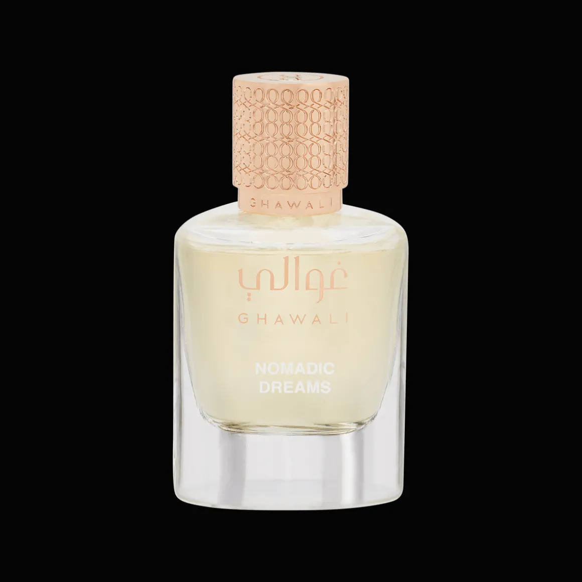 Nomadic Dreams Parfum van Ghawali is een aromatisch houtachtig parfum dat geuren samenbrengt uit verschillende Arabische culturen, verweven tot een onvergetelijke geurbeleving. Het parfum opent met sprankelende noten van bergamot en mandarijn, ondersteund door de pittige frisheid van gember. In het hart ontvouwt zich een rijke melange van roos en saffraan, versterkt door de diepte van oud. De basis sluit af met warme akkoorden van amber, vanille en een vleugje cacao.