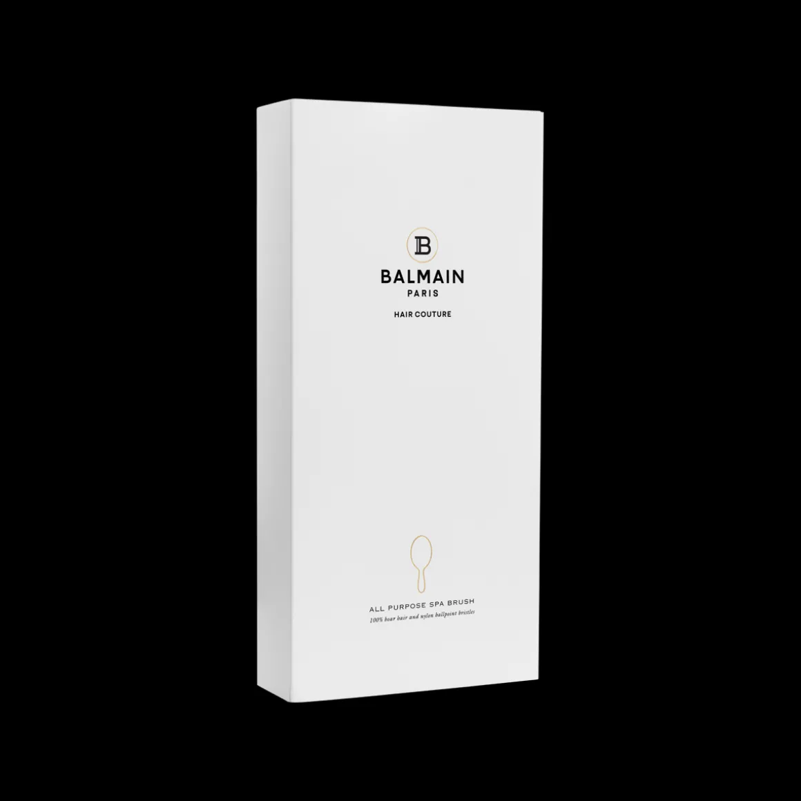 De All Purpose Spa Brush van Balmain Hair is geschikt voor de verzorging van haar met extensions, dik haar en halflang tot lang haar. De borstel, die bestaat uit een mix van zwijnen- en nylon haren, heeft een unieke structuur die de natuurlijke oliën van de wortels tot aan de uiteinden verdeelt. Het haar wordt ontward zonder hierbij aan het haar te trekken en wordt dankzij de borstel gezond en glanzend, zonder stylingproducten. De natuurlijke eigenschappen van de zwijnenharen helpen het haar te conditioneren en werken als een anti-pluisserum dat droog haar herstelt en glans geeft. Door de zwarte rubberen basis en de gebogen, mat gecoate handgreep biedt de borstel een betere en comfortabele grip.