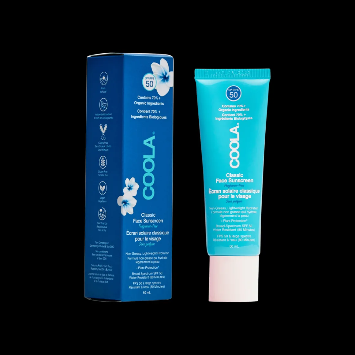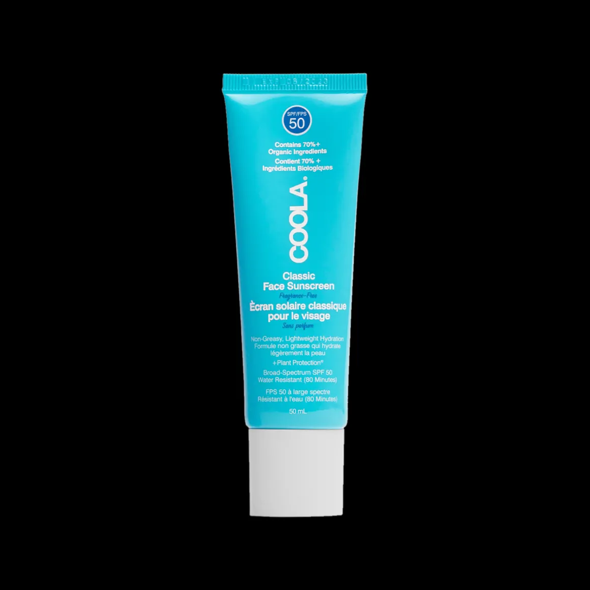 De Classic Face Lotion SPF 50 Unscented van COOLA Suncare geeft bescherming tegen de zon en is hydraterend. De lotion biedt een breed spectrum aan UVA / UVB-bescherming en hydrateert de huid. Geformuleerd met COOLA Suncare’s Plant Protection Complex, biedt de geurvrije zonnebrandcrème voor het gezicht een gewichtloze bescherming die ook perfect onder make-up past.