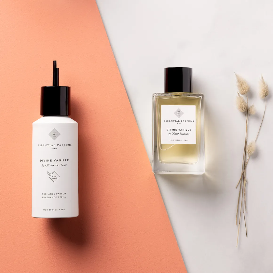 De Divine Vanille eau de parfum 150ml Recharge van Essential Parfums is een duurzame navulverpakking van het Divine Vanille eau de parfum. De geur brengt een ode aan vanille-absolue, duurzaam geproduceerd in Madagascar. Natuurlijke tonkaboon en benzoë verhogen de zachte, balsemachtige en verslavende facetten van vanille. Een mix van natuurlijke kaneelschors en sensuele leerachtige tonen van natuurlijke osmanthus onthullen tabak en gedroogd fruit. Cederhout en patchouli brengen een romige en houtachtige structuur die extra wordt benadrukt door zijdenachtige musk, die de geur in een delicate en weelderige sluier hult.