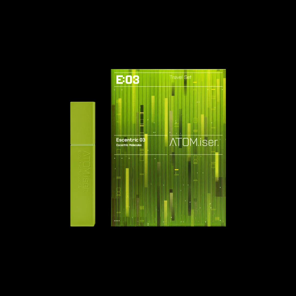 Ontdek de Escentric 03. Atomiser Set van Escentric Molecules, een verfijnde geurverpakking in reisformaat. De ATOM.iser. is gemaakt voor duurzaamheid en ontworpen om je levensstijl onderweg te verbeteren. Het draai-en-spuitmechanisme zorgt ervoor dat je je favoriete Escentric Molecules-geur altijd bij de hand hebt. Escentric 03 eert Vetiveryl Acetate, een natuurlijke wortel plus synthetische hybride. Het verleidelijk sensuele aromaprofiel van vetiver gaat verder dan de samenstelling. Dit akkoord heeft een scherpe, zuivere scherpte met een bruisende kwaliteit die prachtig speelt in het landschap van huidgeuren. Stel je de scène voor: een zachte rivier kronkelt door groene vlaktes. Aan de horizon komt een oranje zon op achter pluizige wolken. Dit is geen pastoraal schilderij of een plaatje uit een literaire klassieker. Dit is een olfactorische herinnering aan Escentric 03.