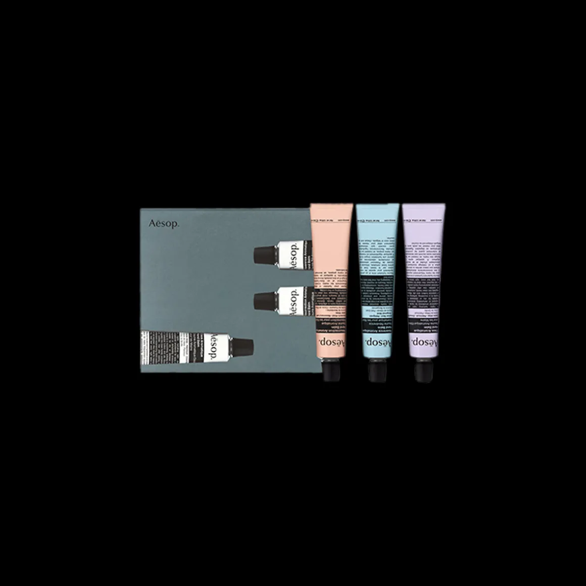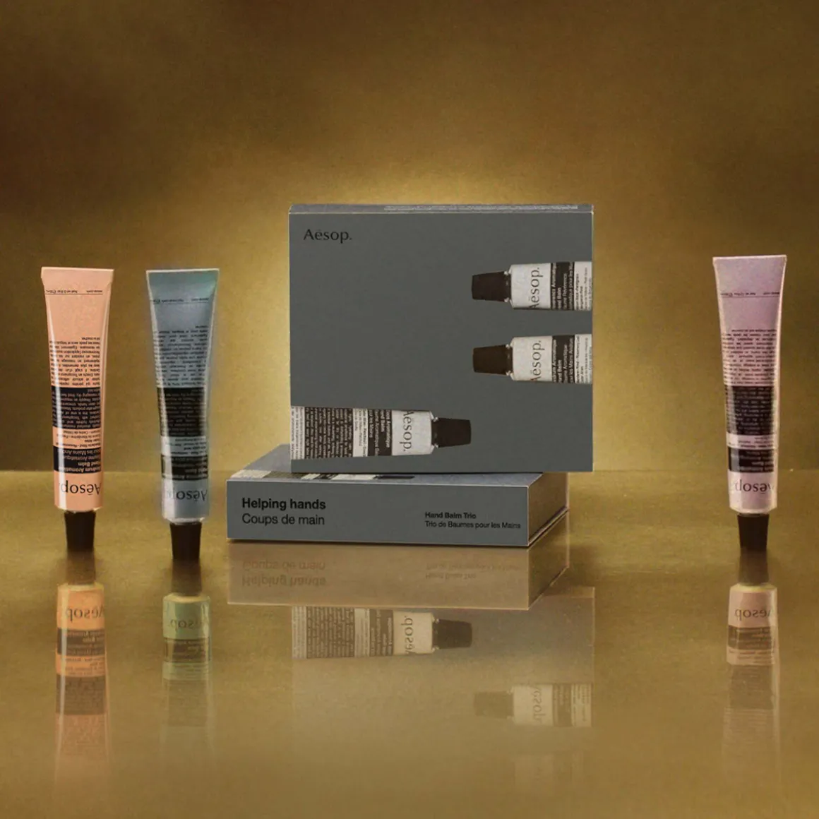 Ontdek Helping Hands Trio van Aesop, een trio van de meest geliefde formules: Resurrection (30ml), Reverence (30ml) en Eleos Aromatique Hand Balms (30ml).