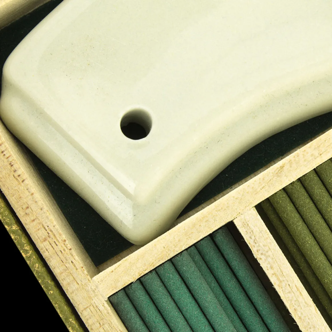 Ontdek Mori No Kaori Incense van Nippon Kodo. Drie bosgeuren: den, hinoki ceder en cederhout. De paulowniahouten doos beschermt het wierook tegen vocht. Links komt de houtachtige noot van den samen met de diepte van hars voor een vochtige en frisse geur, als een rustig bos bij een kabbelende beek. In het midden zorgt de houtachtige noot van hinoki of Japanse cipres voor een ontspannend en verfrissend gevoel, als de wind die door de bomen waait. Rechts doet de groene houtachtige geur met een verfrissende cedernoot denken aan een ochtend in het bos, schone lucht en vogelgezang. Nippon Kodo gebruikt natuurlijke grondstoffen van de hoogste kwaliteit. Hout, kruiden en specerijen worden volgens waardevolle traditionele technieken gemengd om wierook van uitzonderlijke kwaliteit te produceren.