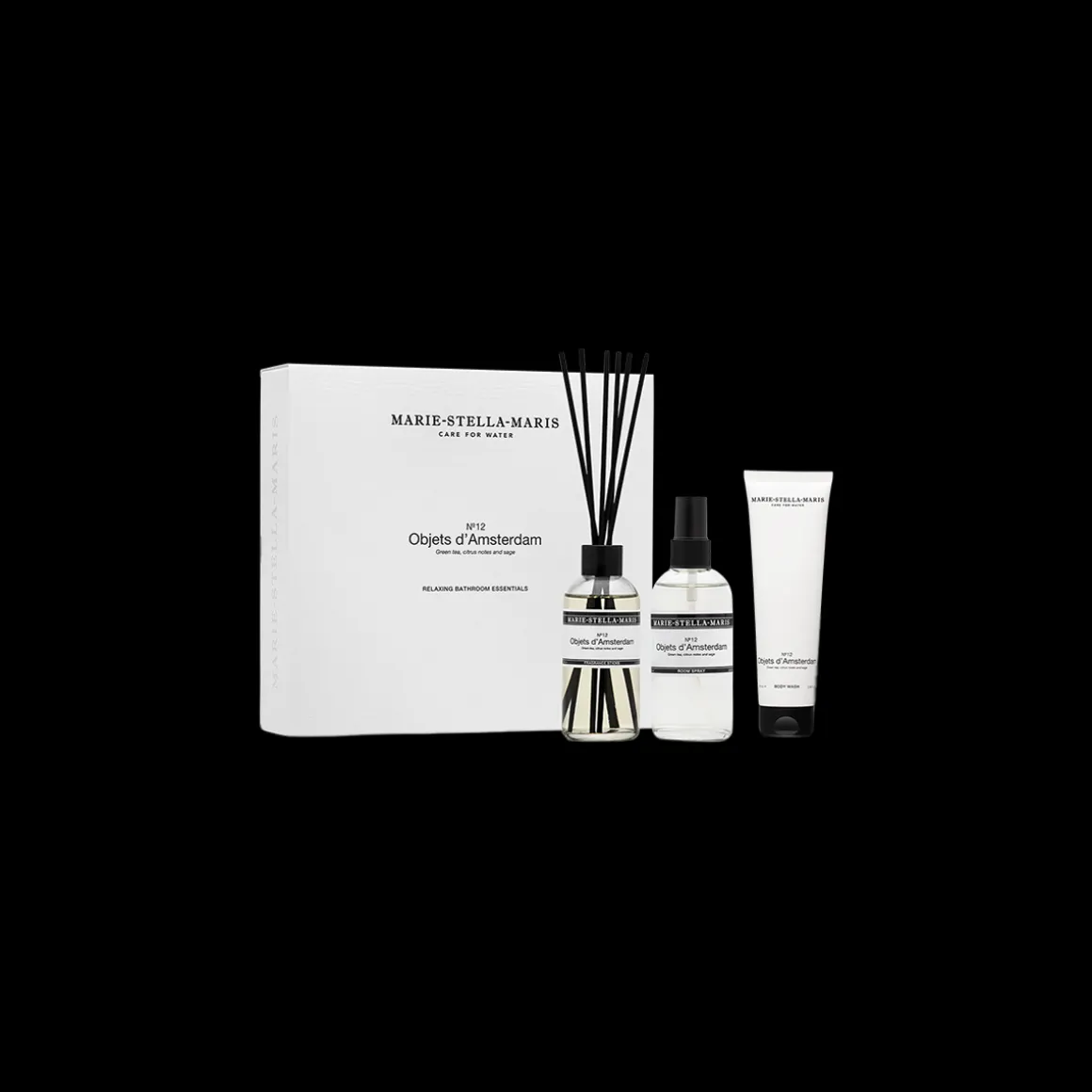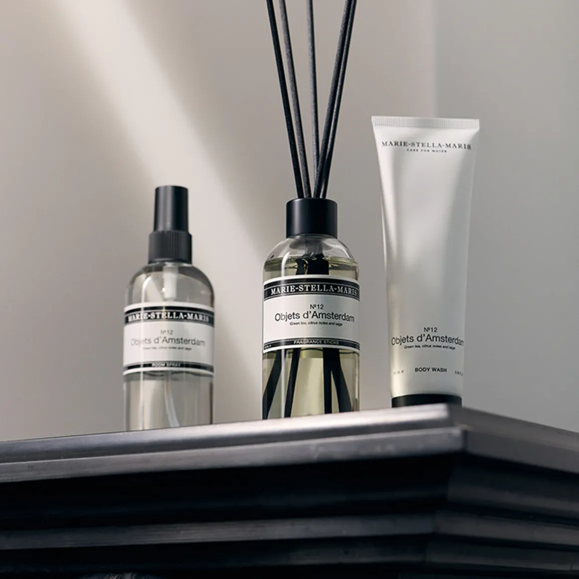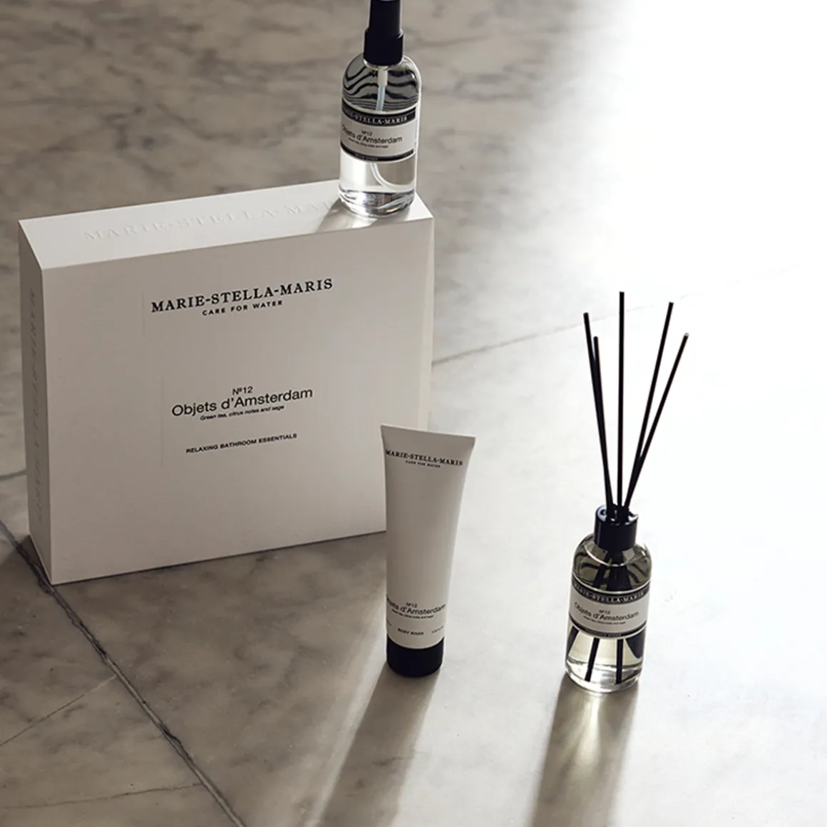 Objets d’Amsterdam Relax Bathroom Essentials Set van Marie-Stella-Maris creëert een rustgevend ritueel voor elke dag. De geurstokjes verspreiden langdurig een verfijnde geur, de roomspray verfrist de ruimte in één beweging, en de milde body wash verzorgt de huid onder de douche.