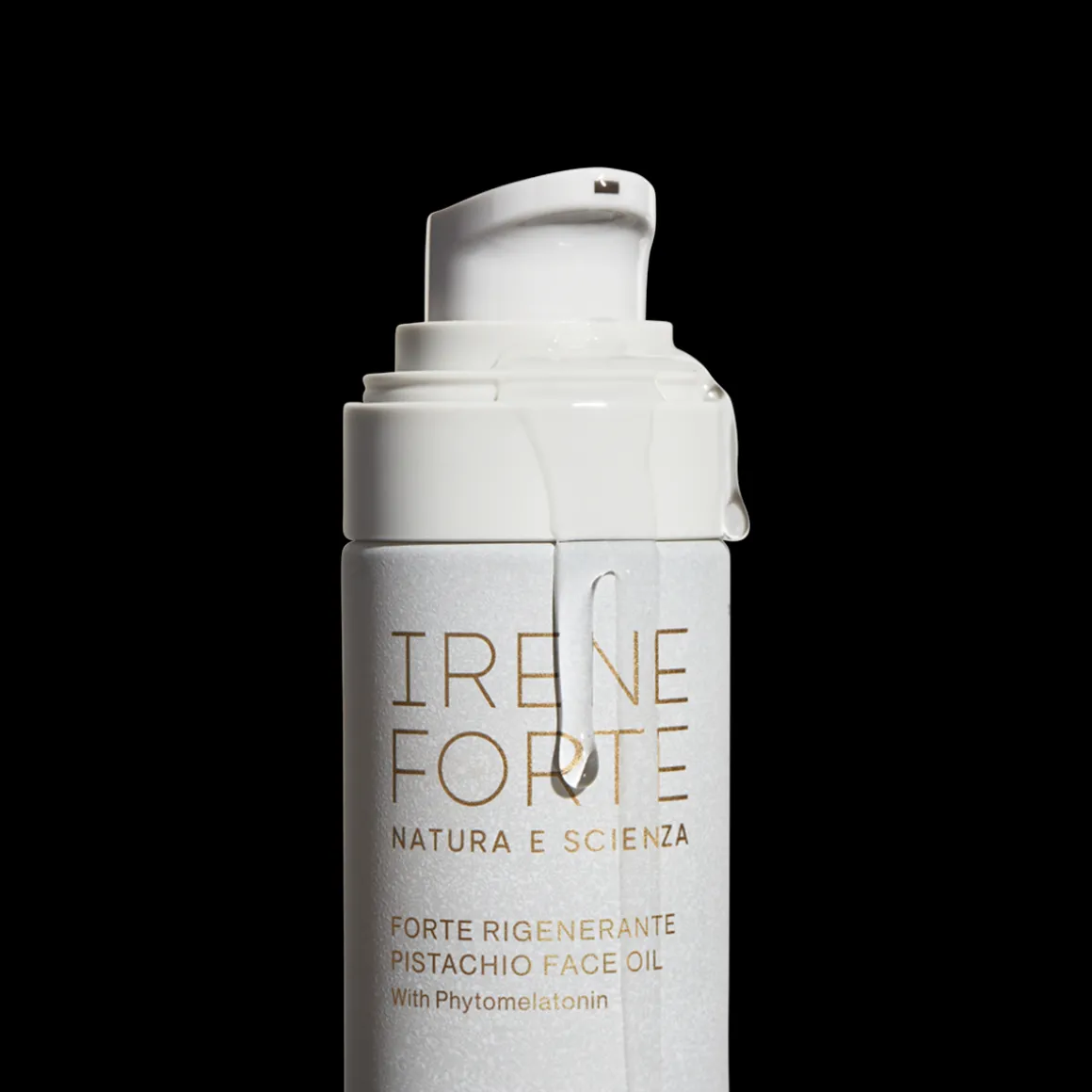 De Pistachio Face Oil van Irene Forte is een olie die snel intrekt en zichtbare tekenen van veroudering vermindert. Deze gezichtsolie bevat 28% gestabiliseerde vitamine E en het bijzondere fytomelatonine. Dit ingrediënt, gewonnen uit Italiaanse Alpenplanten via een gepatenteerd proces van Dr. Francesca Ferri, stimuleert huidvernieuwing en behandelt tekenen van veroudering door invloeden van buitenaf. Een blend van omega-rijke oliën, waaronder Siciliaanse pistache-olie, versterkte de formule en hydrateert en beschermt de huid effectief.