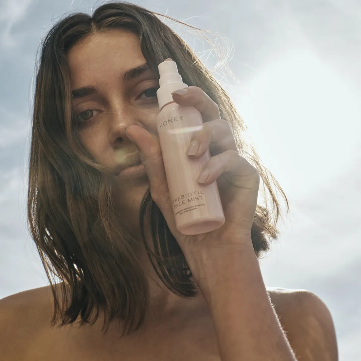 Prebiotic Face Mist van HONEY is verrijkt met krachtige ingrediënten, waaronder huidondersteunende prebiotica, krachtige antioxidanten, hyaluronzuur en een uniek 24-uurs vochtcomplex. Zorgt voor een fris gevoel van hydratatie en vitaliteit en verjongt het microbioom van de huid.