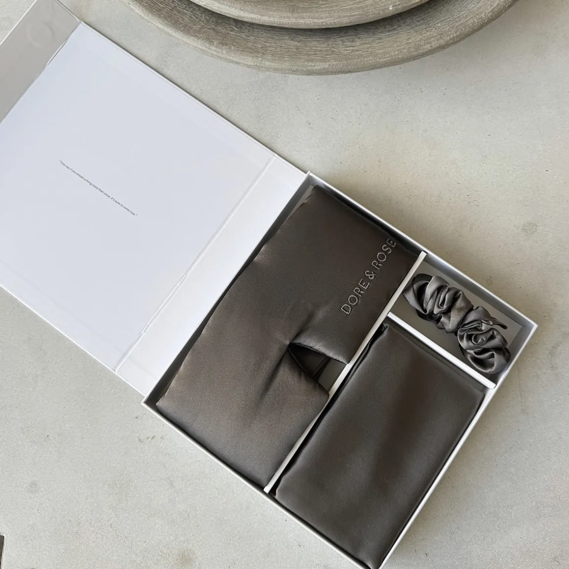 Ontdek de Serenity Bundle van Dore & Rose. De kussensloop en het slaapmasker weren niet alleen bacteriën af en verminderen wrijving tegen de huid, maar verbeteren ook de effectiviteit van andere huidverzorgingsproducten door vochtabsorptie te voorkomen.