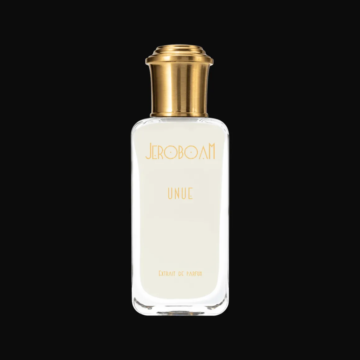 Krachtig maar niet overweldigend, Unue Extrait de Parfum van Jeroboam, een bloemig-houtachtige expressie in sandelhout en musk die zorgen voor een sensuele aanwezigheid. Noten van Italiaanse bergamot, Egyptische jasmijn en ylang-ylang zetten meteen de toon en laten hun kleuren zien. Stralend en sierlijk als een witte bloem, tovert de topnoot een bloemig wit dat doorkruist lijkt door een lichtstraal. In het hart ligt een fruitig akkoord. Een ingetogen accent van pruim en ananas vermengen zich met een combinatie van roze bessen en anijs. Om de houtachtige dichtheid van de dry-down te benadrukken, weeft de parfumeur een achtergrond van musk en troostend, zijdeachtig en melkachtig sandelhout dat één wordt met de huid. Een spoor dat zichzelf kenbaar maakt met finesse en elegantie.